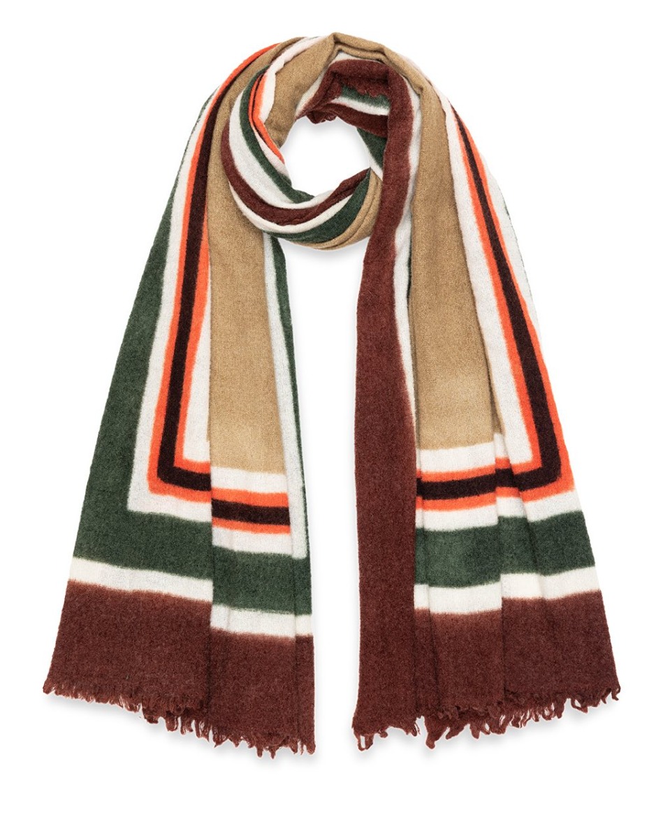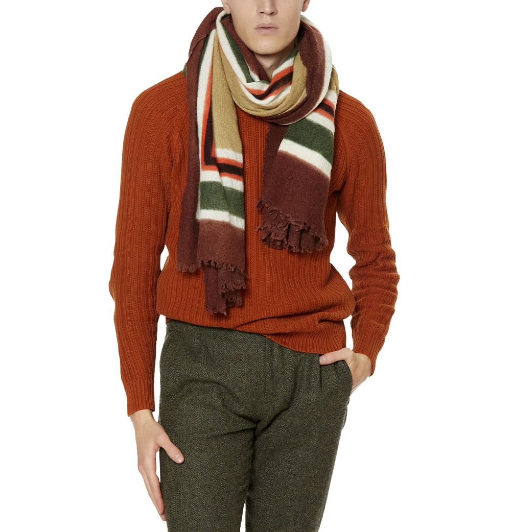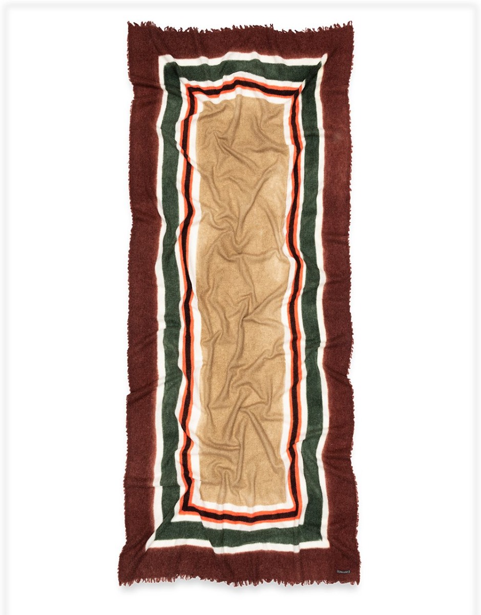 Faliero Sarti's predilection for color combinations, as in this scarf with a brown, green and orange frame, will complete your looks in the best possible way. Made of a wool and cashmere blend, it is finished with frayed edges. Perfect for illuminating neutral-toned garments.