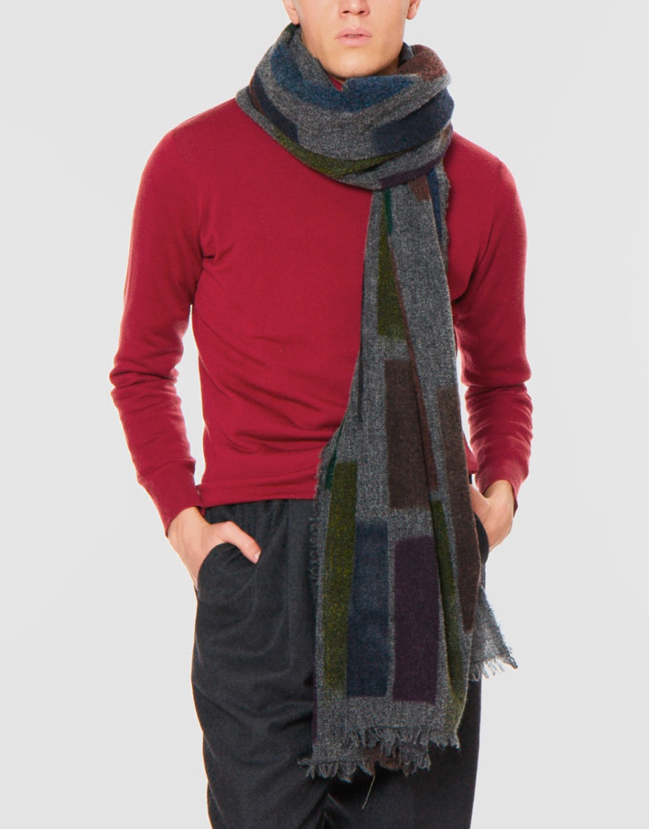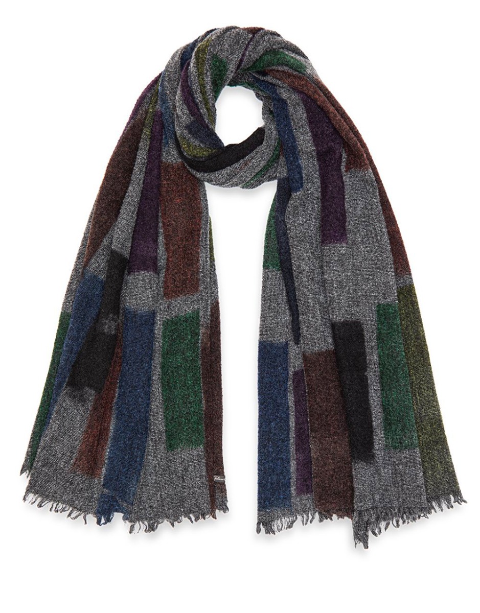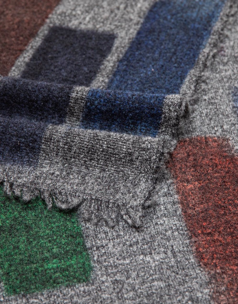 Made of a soft blend of virgin wool, cashmere and silk, the Bricks scarf on a dark gray and multicolor brick base is finished with frayed edges. This warm winter accessory will mix with jackets and coats with great ease.
