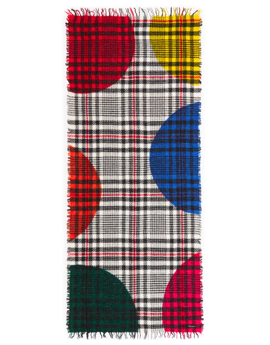 The Markos scarf in cashmere, wool and silk outlined by a background with a geometric pattern amuses with its maxi multicolor polka dots.