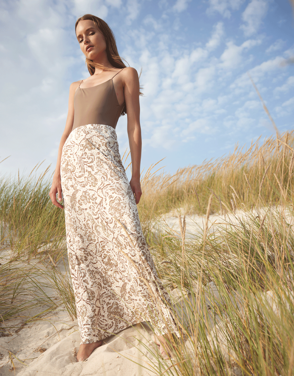 Behind each skirt Faliero Sarti hides a careful selection of fine fabrics and a tailoring care that makes every garment unique. The printed viscose, fluid and enveloping, moves with lightness and enhances the botanical, geometric or artistic patterns of the collection. Natural linen, on the other hand, lends itself to more structured silhouettes, embellished with refined embroideries that give a poetic and timeless touch. An invitation to rediscover the essence of femininity through the elegance of summer skirt's details.