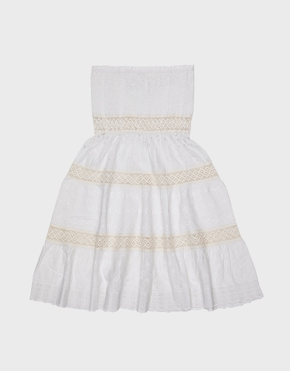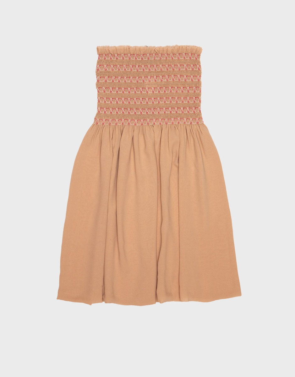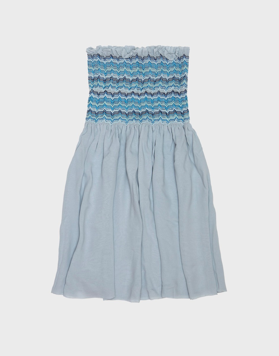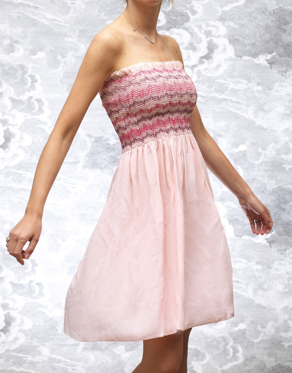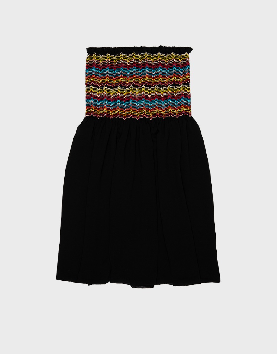 Abito corto a fascia in misto seta con dettaglio elastici colorati cuciti.