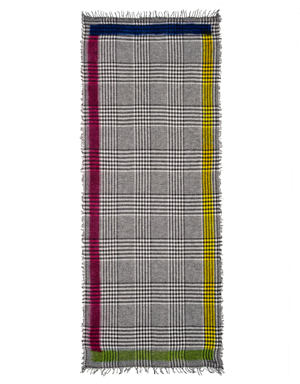 Rectangular cashmere scarf with Prince of Wales print. Size 190x70 cm.