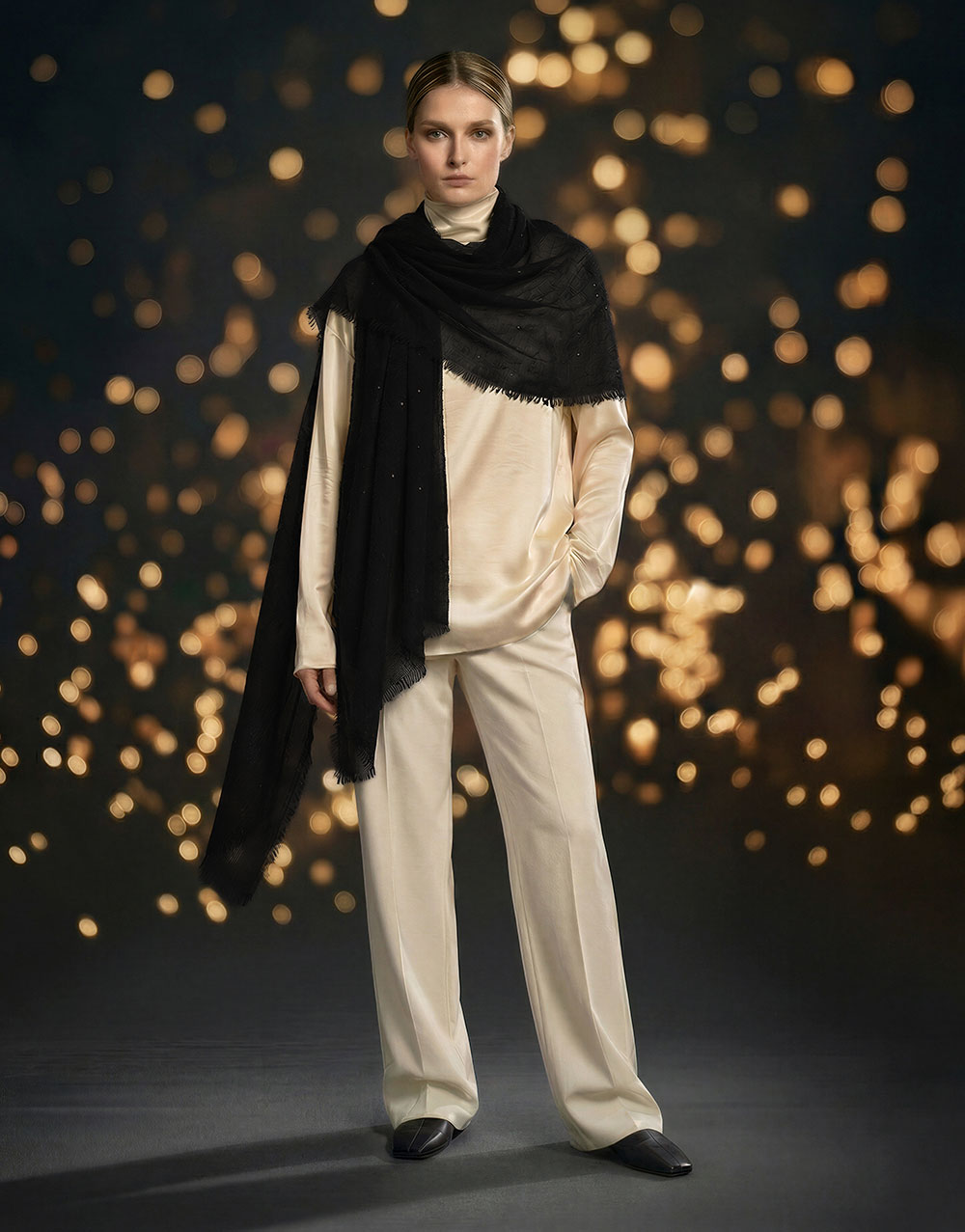 Among the must-haves of the collection we offer the Adriel scarf, the Ginevra in its gradient variations and the refined Enrica in cashmere and silk. The stoles are also embellished with prints created in collaboration with renowned artists and institutions, for a unique and distinctive accessory.
